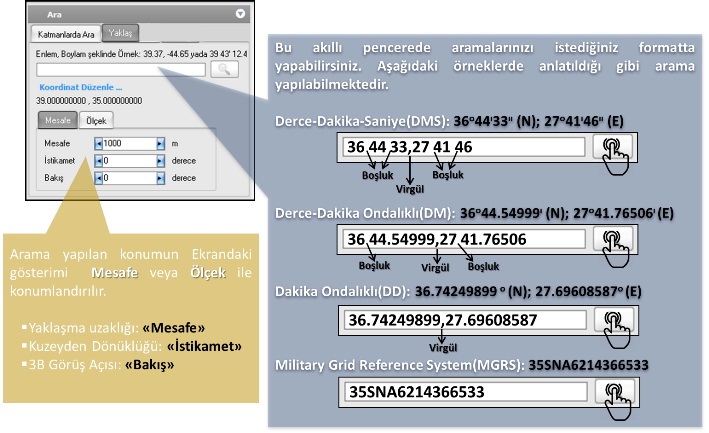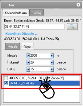Bu pencere arama türü farketmeksizin uygun tipte yazılan bütün koordinatlara