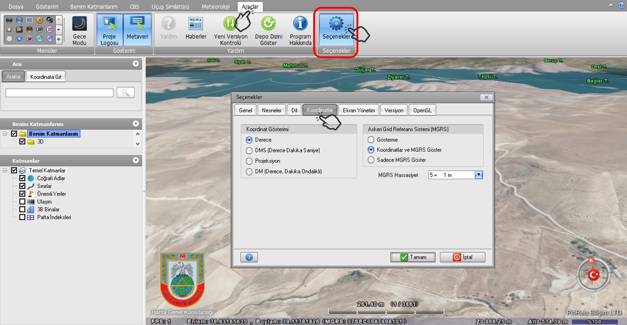 Seçenekler > Koordinatlar" bölümü size rehberlik